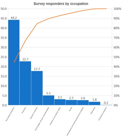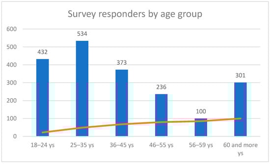 The study included 1976 people ranging in age from 18 years to 94 years (median 39.55 years; SD ± 15.93 years), including 1042 health professionals and 934 people from the general population (non-medical professions). The exact numbers and characteristics of the individual subgroups of the respondents are presented in Figure 1, Figure 2 and Figure 3 and Table 1.