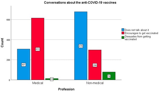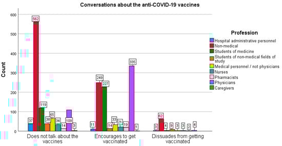 Data concerning conversations about vaccinations against COVID-19 undertaken in the two groups of the surveyed population, non-medical and medical professions, is presented in Figure 9 and Figure 10.