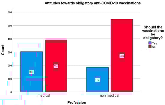 In our study, as many as 45.5% of the medical group supported the idea of obligatory vaccinations against COVID-19 and only 27.4% of respondents from the non-medical group. In a December 2020 study from the UAE, 72.9% of healthcare professionals were in favor of compulsory vaccination for all citizens and residents in this country, while 27% were against. In the compulsory vaccination group, respondents were more likely to be vaccinated as soon as a vaccine became available, so probably they are less concerned about side effects [].