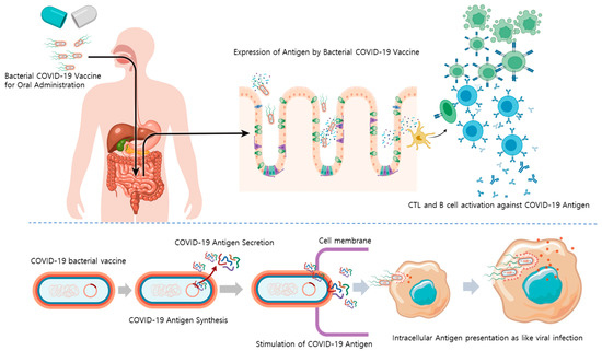 Information on the features of this coronavirus is still lacking, making vaccine production with traditional vaccine platforms (such as using live-attenuated virus) a challenge. Among the available development strategies, mRNA vaccines based on the genetic information of the virus strain rather than virus itself is now preferred and generalized as a new method for developing an anti-coronavirus vaccine [5,6,9]. However, in the case of the currently commercialized viral vector- and RNA-based vaccines, due to the short development period and limitations of clinical evaluation, some side effects have been reported. In particular, there are public concerns about the incidence of anaphylaxis, thrombosis with thrombocytopenia syndrome (TTS), Guillain–Barré syndrome, myocarditis, and pericarditis associated with these RNA- and virus-based vaccines [10], which are mainly due to the excessive activity of the immune system in response to the injection of excessive amounts of inflammatory substances directly into the body. Despite these negative aspects of the currently available COVID-19 vaccines, they are indispensable for managing and controlling the ongoing global pandemic. Under this circumstance, research on the development of new, rapid, and safer vaccine technology is necessary. Thus, bacterial-based orally administered vaccines have attracted attention as a safer vaccine technology compared with vascular or intramuscular injection approaches, and are also a rapid vaccine development platform for new infectious diseases such as COVID-19.