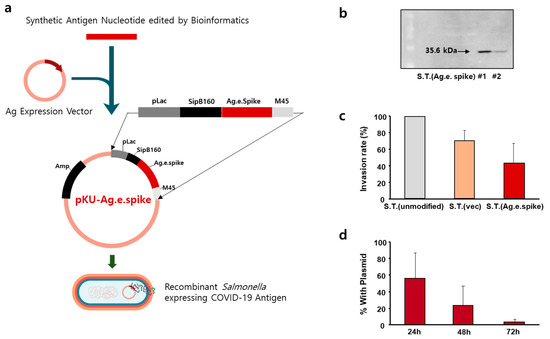 Three types of antigens were synthesized based on bioinformatics data on the genetics of antigens that can be used for developing COVID-19 vaccines. As a vector capable of expressing an antigen in Salmonella, a plasmid using the lac operon was prepared. SipB160, which was edited with a signal peptide and bound to the antigen sequence, was used for granting the antigen secretion mechanism to the Salmonella model. The designed plasmid was synthesized and transformed into the bacteria. In this process, after confirming the cloning of the vector in Escherichia coli, the produced plasmid was transformed into a shuttle Salmonella strain and into a Salmonella strain that could be used as vaccine (Figure 2a). To confirm that the antigen was well expressed in the prepared vaccine candidate strain, three types of coronavirus protein antigen candidates were prepared. After culturing the strain, expression of engineered spike proteins was confirmed by Western blotting (Figure 2b) and expression of antigens of various sizes was also confirmed using this engineered strain (Supplement Figure S1). The characteristics of these bacteria strains were compared by measuring the ability of the bacteria to infect macrophages (Figure 2c). Compared with the unmodified strain, the infection rate was reduced by more than 50% in the strain transformed with the protein expression vector. In addition, evaluation of the expression of the vector during subculture confirmed that the bacteria lost all protein expression vectors within 72 h (Figure 2d).
