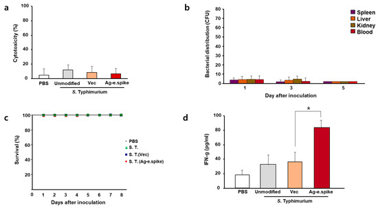 In vitro and in vivo effects of S. Typhimurium expressing Ag-e.spike. (a) LDH cytotoxicity assays were performed on cell-free supernatants from Raw 264.7 cells treated with phosphate-buffered saline (PBS) or attenuated unmodified S. Typhimurium, S. Typhimurium carrying the empty expression vector (vec), or S. Typhimurium expressing Ag-spike. The data represent the mean ± standard error of three independent experiments. (b) Bacterial distribution was examined in mice after oral administration 1 × 107 bacterial cells for the indicated time. (c) Survival curves of all mice groups were recorded for up to 8 days. (d) Mice were treated with PBS or 1 × 108 bacteria cells. Serum was collected 7 days after inoculation and interferon-γ (INF-g) levels were analyzed with enzyme-linked immunosorbent assay (ELISA). (* p < 0.05 versus S. Typhimurium (Vec)-treated mice; Student’s t-test).