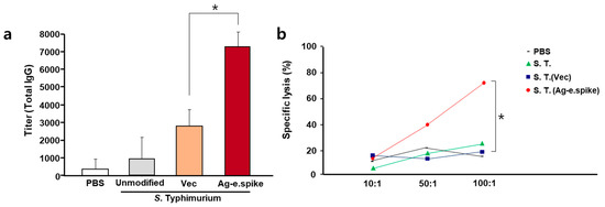 In vivo effects of oral treatment with S. Typhimurium expressing Ag-e.spike. Balb/c mice were orally inoculated on days 1, 14, and 28 with PBS or with 1 × 107 CFU of attenuated unmodified S. Typhimurium, S. Typhimurium carrying the empty expression vector (vec), or S. Typhimurium expressing Ag-spike. (a) Mice were bled every 2 weeks, and total IgG antibody titer was determined by ELISA using equally pooled sera samples from each experimental group. (b) Comparison of S protein-specific CTL activities in BALB/c mice orally immunized with 107 bacteria cells at 0, 2, and 4 weeks. One week after the last immunization, spleen cells were obtained and restimulated in vitro with the recombinant S protein-pulsed syngeneic stimulator cells. The specific cytolytic activity was tested against syngeneic targets in an LDH release assay. Spleen cells from unimmunized mice were used as control. Results represent mean specific lysis values from representative individual mice tested at the indicated effector:target cell ratios. (* p < 0.05 versus S. typhimurium (Vec)-treated mice; Student’s t-test).