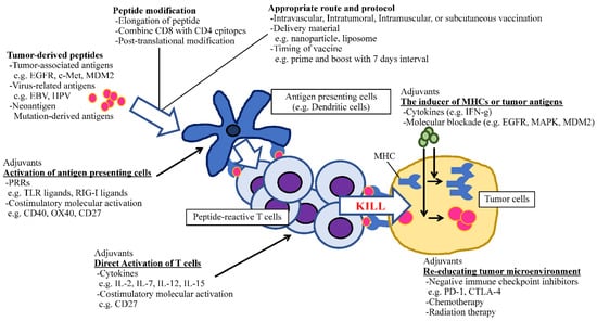 In addition to molecule-targeted therapies, immunotherapy is regarded as a rapidly developing field in cancer treatment. Because of the success of checkpoint inhibitors by which the survival of heavily pretreated cancer patients has been increasing [153,154], we have firm evidence that immune cells can fight against cancer. Thus, the vital question that remains to be answered is how to stimulate the appropriate antitumor immunity without eliciting life-threatening autoimmunity. Peptide-based immunotherapy has an advantage against non-specific immune activation due to its tumor-antigen selectivity. To apply this promising approach in clinical practice, several factors which could potentiate the effect of antitumor peptide vaccines should be optimized, such as the identification of epitopes that can induce antitumor HTLs and CTLs, the length of amino acids, the selection of potent adjuvants including PRRs, costimulatory molecule agonists and cytokines, and optimal regimens (dose, schedule, and administration route) [39]. The recent understanding of peptide–adjuvant combinations is useful for establishing efficient cancer vaccines (Figure 1). Therefore, the ideal time has arrived to concentrate our knowledge and experience to open new avenues for developing cancer peptide vaccines that have clinical significance.