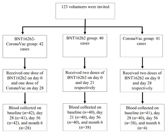 The study was divided into three groups; participants in each group were vaccinated with different types of SARS-CoV-2 vaccine, including the BNT162b2, CoronaVac, and Combo (BNT162b2- CoronaVac) vaccine. In the BNT162b2 group, first and second doses of COVID-19 vaccines were vaccinated at day 0 and day 21 with the homologous vaccine, while the CoronaVac groups were vaccinated on day 0 and day 28. In the Combo vaccine group, participants received heterologous BNT162b2 and CoronaVac vaccines on day 0 and day 28, respectively. The study did not set a random mechanism and did not blind the participants and investigators. The participants could choose the type of vaccination according to their personal wishes and were notified of the collection of blood at baseline, day 21 (BNT162b2) or day 28 (CoronaVac and Combo vaccine), day 56 and month 6 (Figure 1).