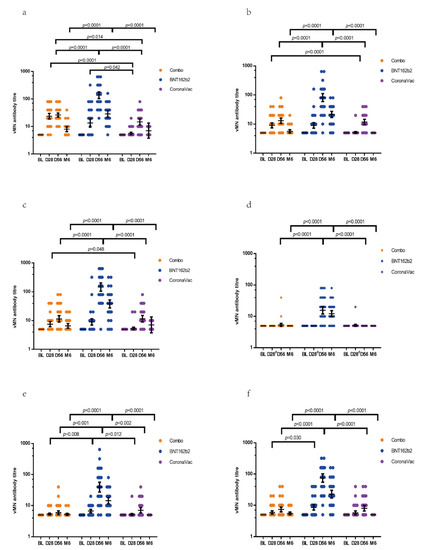 Comparison of immunogenicity of three vaccination strategies. SARSA-CoV-2 naïve individuals were invited to participate in the vaccination programme. In the Combo group, subjects received one dose of BNT162b2 on day 0 and one dose of CoronaVac on day 28. Then, blood samples were collected on the baseline, day 28, day 56 and month 6. For BNT162b2, subjects recieved two doses of BNT162b2 at the baseline and day 21 respectively and blood was taken at the baseline, day 21, day 56 and month 6. For CoronaVac, Individuals received two doses of CoronaVac vaccine at the baseline and day 28, respectively, and then blood was taken at the baseline, day 28, day 56 and month 6. The live virus microneutralization assay (vMN) was used to determine the level of neutralizing antibodies in serum against (a) wild type, (b) D614G, (c) alpha, (d) beta, (e) theta and (f) delta. BL: baseline; D28: day 28 for Combo and CoronaVac, day 21 for BNT162b2; D56: day 56; M6: month 6. To analyse the difference in immunogenicity between two groups, a post hoc multiple comparison was performed, and a p value was shown on the graph if the value was less than 0.05, which represents a statistically significant difference.
