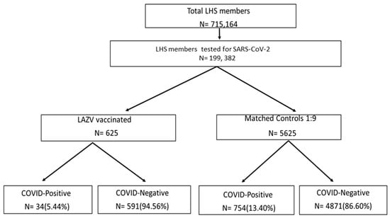Data regarding demographics, laboratory results, and ICD-9 codes were derived from the LHS electronic medical records (EMR) system. COVID-19 RT-PCR testing of samples derived from nasopharyngeal swabs was performed by experienced personnel in a single centralized laboratory according to international guidelines [27]. All LHS enrollees who had been tested for COVID-19 during the study period were included in the present study. Subjects who purchased the LAVZ vaccine, according to pharmacy data, and received the injection, according to the specific nursing code, prior to COVID-19 RT-PCR testing were identified. Vaccinated patients were matched to controls using 1:9 ratios. Matching was based on age, gender, and the presence of certain chronic disorders (diabetes mellitus (DM), hypertension, ischemic heart disease (IHD), asthma and chronic obstructive pulmonary disease (COPD)), selected according to their association to COVID-19 infection [28].