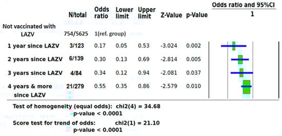 To strengthen the effect of LAVZ vaccine on the likelihood of COVID-19 PCR positivity, a separate analysis based on of time of vaccination before PCR testing was performed. As compared to individuals who were not vaccinated against VZ, those who were vaccinated one year before COVID-19 PCR testing had an OR of 0.17 (95% CI 0.05–0.53, p = 0.002), those vaccinated two years before COVID-19 PCR testing had an OR of 0.30 (95% CI 0.13–0.69, p = 0.005), those vaccinated three years before COVID-19 PCR testing had an OR of 0.34 (95% CI 0.12–0.94, p = 0.037), and those vaccinated four or more years before COVID-19 PCR testing had an OR of 0.55 (95% CI 0.35–0.86, p = 0.010) (Figure 2).