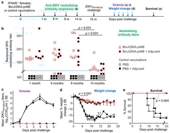Vaccination, antibody assays, and ZIKV challenge. (a) Schematic illustration of the timeline of the study. (b) Anti-ZIKVPRVABC59 50% neutralizing antibody titers for individual mice. ND—Not Detected. Limit of detection was a 1 in 30 dilution of serum. Adjuvant provided no statistically significant improvement at any time point. BinJ/ZIKA-prME vs. Controls p = 0.031 (6 months), p = 0.005 (1, 9 and 14 months). Nine vs. 14 months, p = 0.031 for both vaccine groups. Statistics by Kolmogorov–Smirnov tests. (c) Mean viremias after s.c. challenge with ZIKVPRVABC59 (n = 6 mice per group, except PBS n = 5). The limit of detection was 2 log10CCID50/mL per mouse. BinJ/ZIKA-prME vaccinated mice vs. Control vaccinated mice, p = 0.005 for days 2 to 5; statistics by Kolmogorov–Smirnov tests. (d) Mean percent body weight changes; with percent change for each mouse calculated relative to day 0 for that mouse. For BinJ/ZIKA-prME vaccinated mice vs. Control mice; repeat measures ANOVA days 4 to 8, p < 0.001. (e) Survival. Mice were euthanized when they reached ethically defined end points. Statistics by Kaplan–Meier log-rank tests. All the data were derived from one group of mice.