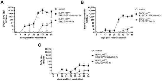 Development of neutralizing antibody titers after vaccination with BuPV_ΔNpro_E1E2 CP7. Mean neutralizing antibody titers against the homologous strain BVDV-1 CP7 (A), the heterologous (challenge) strain BVDV-1 SE5508 (B), and BuPV (C) were determined after one shot vaccination with live (live 1x) (28 days post first vaccination of the one-shot group) or two shots vaccination with inactivated (inactivated 2x) (0 and 28 days post first vaccination) BuPV_ΔNpro_E1E2 CP7.
