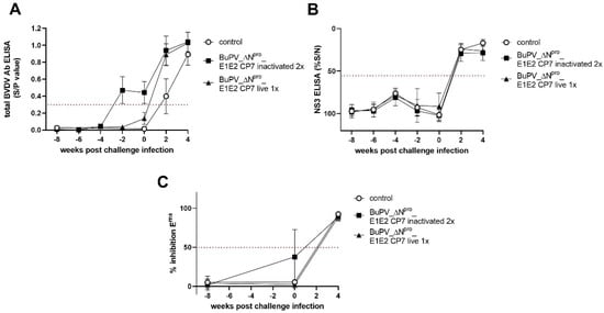 Kinetics of BVDV E2−-, NS3−- and Erns−-specific antibodies after vaccination and challenge infection. ELISA testing was performed on BuPV_ΔnproΔNpro_E1E2 CP7−-vaccinated and BVDV-1 challenged cattle. The animals were either vaccinated with one (1x×) shot of live or two (2x×) shots of inactivated candidate vaccine. A total BVDV Ab ELISA was performed (A) to monitor the serological response after vaccination and challenge infection. The presence of NS3−- and Erns−-specific antibodies were determined by a competitive NS3 (p80) antibody ELISA (B) and a competitive E0 (Erns) antibody ELISA (C). Relative blocking values (% S/N (B), % inhibition Erns (C)) are indicated as mean group values. Error bars represent standard deviations. The cut-off values of the tests are marked through dotted lines.