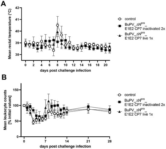 Mean rectal body temperatures and kinetics of blood leukocyte counts after BVDV-1 challenge infection of BuPV_ΔNpro_E1E2 CP7-vaccinated cattle. The animals were vaccinated with one shot of live (live 1x) or two shots of inactivated (inactivated 2x) BuPV_ΔNpro_E1E2 CP7. (A) Mean group values of the rectal body temperature after the challenge infection are depicted. Temperatures lower than 39.5 °C are considered as physiological temperature, higher than 40 °C as fever. (B) Course of mean blood leukocyte counts after the challenge infection is presented. Mean values of the different groups are shown in percentage of the initial values (number of leukocytes measured at the day of challenge infection). The initial values (measured value at day of challenge) were set to 100%. Error bars represent standard deviations.