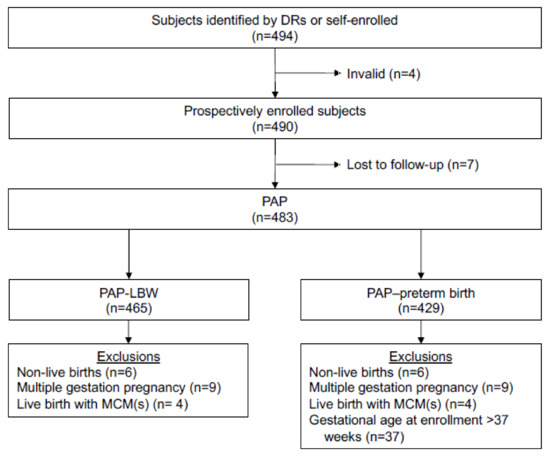 Flow diagram of the overall study population and exposure. HCP, healthcare provider at participant obstetrics/gynecology clinic; LBW, low birth weight; MCM, major congenital malformation; PAP, primary analysis population. For the 483 pregnant persons in the PAP, infant outcome data were reported for 485 infants; 9 pregnant persons carried twin pregnancies, of which one resulted in a spontaneous abortion; and there were 2 stillbirths and 3 spontaneous abortions among the singleton pregnancies. Subjects excluded from the PAP-LBW and/or PAP-preterm birth can be counted in more than 1 category.