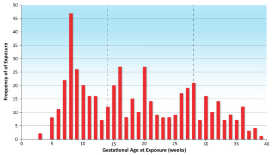 This was a descriptive study, and a planned sample size of 550 (with an anticipated loss to follow-up of ~10%, for a final evaluable population of 500 pregnant persons) was not based on a statistical hypothesis to be tested but instead was determined based on the US background prevalence of MCMs (2.8%), preterm births (11.4%), and LBW (8.0%) according to the CDC MACDP and National Vital Statistics System (NVSS), as available at the time the study was designed [19,20]. Assuming 166 first-trimester exposure pregnancies [21], the study was expected to have at least 80% power to detect a 2.5-fold increase in the prevalence of MCMs and >99% power to detect a statistically significant 2.0-fold increase in preterm births or LBW.