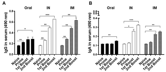 Parenteral immunization, such as intramuscular (IM) vaccine delivery, is one of the most commonly used methods of immunization. However, IM inoculation of vaccine components rarely induces mucosal immunity and requires multiple immunizations to mount adequate antibody responses in vaccinees [1]. For this reason, alternative vaccination routes such as oral and intranasal (IN) inoculation of vaccines are actively being investigated. While both oral and IN routes can elicit a strong mucosal immune response, adverse events have been reported from the latter. In fact, Guillain-Barre syndrome, encephalomyelitis, Bell’s palsy, and other neuropathological vaccine-associated adverse events were reported from individuals receiving intranasal influenza vaccines [2]. Oral immunization, though not as effective as the IN route in terms of immunity induction, is generally perceived to be safe, easy to administer, and able to stimulate both systemic and mucosal immune responses [3,4]. Therefore, developing effective vaccines that are administered through the oral route could yield promising results.