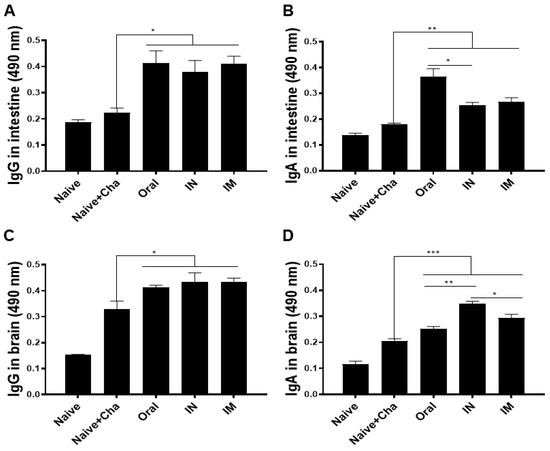 To evaluate the induction of mucosal immunity, antibody production in the intestines of mice was observed. Mice were sacrificed at 35 dpi and mucosal antibody responses of immunized groups were compared to that of the Naïve+Cha control group. T. gondii-specific intestinal IgG inductions were similar for all immunized mice, regardless of vaccine administration routes. Infecting unimmunized mice with T. gondii resulted in a negligible increase in intestinal IgG compared to naïve control (Figure 3A). Intestinal IgA responses were similar for the control groups. Incremental changes in T. gondii-specific IgA levels were detected from Naïve+Cha. Surprisingly, the highest IgA inductions were observed from orally immunized mice, whose levels were higher than those elicited by IN or IM immunization (Figure 3B). As with intestinal IgG, intracerebral IgG responses were enhanced following immunization. Heterologous immunization with the ROP18 vaccines resulted in significantly increased brain IgG levels compared to the control groups, irrespective of the vaccination routes (Figure 3C). An identical trend was also observed for the IgA response in the brain tissues. Mucosally administered ROP18 vaccines induced significantly greater IgA responses than IM administration (Figure 3D).