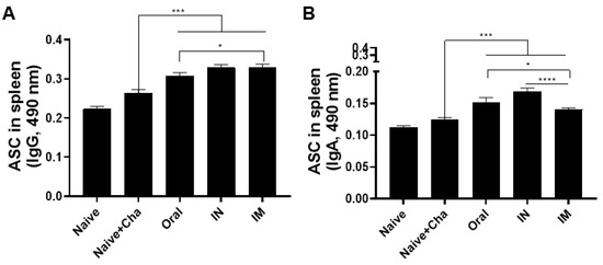 To confirm the ASC responses, splenocytes from mice were collected and cultured for 5 days. A marked increase in the IgG response was observed in the splenocytes of immunized mice (Figure 4A). Noticeable increases in IgA ASC responses were detected following immunization, with IN immunization inducing the strongest response (Figure 4B). Consistent with the serum antibody responses, ASC IgG levels were elevated to a greater extent than the IgA in the immunized mice.