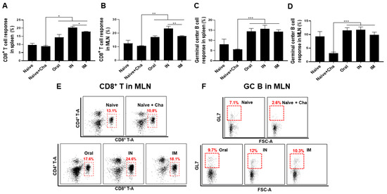 Flow cytometry was performed to evaluate the proliferation of CD8+ T cells in the mouse spleen and MLN. When infected with a lethal dose of T. gondii ME49, a negligible level of T cell depreciation occurred in the unimmunized control. Heterologous immunization ensured that mice retained high levels of CD8+ T cell populations necessary for protection in both spleen and MLN. Specifically, when compared to the Naïve+Cha group, the proportion of splenic CD8+ T cells was enhanced by 1.6-fold, 2.3-fold, and 2-fold in the oral, IN, and IM groups, each, respectively (Figure 5A). Similarly, administering the vaccines via oral, IN, and IM routes resulted in a 1.6-fold, 2.2-fold, and 1.2-fold increase in MLN CD8+ T cell proliferation compared to control, each, respectively (Figure 5B). In both lymphoid organs, IN immunization elicited the strongest CD8+ T cell proliferation. Similar phenomenon was detected for GC B cell responses. Noticeable depreciation in GC B cells occurred in unimmunized mice upon T. gondii infection. This, however, did not occur in immunized mice (Figure 5C,D). In comparison to the Naïve+Cha, splenic GC B cell populations were enhanced by 1.6-fold, 2.3-fold, and 2-fold for the oral, IN, and IM routes, each respectively. Similarly, oral and IN immunization elicited an approximately 3.8-fold increase in GC B cells, whereas IM immunization resulted in a 3.2-fold increase. Overall, GC B cell induction was comparable across the three immunization groups. Scatter plots representing CD8+ T cell and GC B cell populations in MLN for all groups were provided (Figure 5E,F).