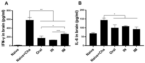 To evaluate the T. gondii-induced inflammatory response in the brain, mice were sacrificed at 35 dpi, and inflammatory cytokine production in the brain tissues was assessed. Compared to the naïve group, drastically high levels of IFN-γ were produced in Naïve+Cha group. Immunizing mice with the ROP18-expressing vaccines resulted in a nearly 3-fold reduction in IFN-γ production in the brain (Figure 6A). Reductions in IL-6 production, though significant, were not as dramatic as in the case of IFN-γ. Immunization, irrespective of the administration route, ensured that IL-6 production was retained near basal levels (Figure 6B).