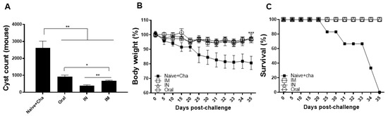 To confirm the protective efficacy of the vaccine against T. gondii ME49 infection, cysts in the brain homogenates were counted under the microscope. An average of 2500 cysts were detected from the Naïve+Cha group (Figure 7A). Substantially diminished cyst burden was observed in the brains of immunized mice. Compared to the Naïve+Cha, cyst reductions were 2.8-fold, 6.8-fold, and 3.9-fold for oral, IN, and IM immunizations, each, respectively. Consistent with this data, the body weights of mice were retained at normal levels (Figure 7B). Body weight reductions were negligible for the immunized mice, with none of the mice experiencing weight loss exceeding 5% of its initial value. In agreement with this data, 100% survival was observed until 35 dpi in the immunized mice. On the contrary, unimmunized mice gradually perished over time and none of the mice survived by 35 dpi (Figure 7C). These results suggest that heterologous immunization using rBVs-ROP18 and VLP-ROP18 vaccines is highly effective.