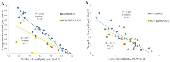 (A): Correlation of change in anti-diphtheria antibodies with baseline titers at week 0 for Entolimod and non-Entolimod treatment groups. (B): Correlation of change in anti-tetanus antibodies with baseline titers at week 0 for Entolimod and non-Entolimod treatment groups.