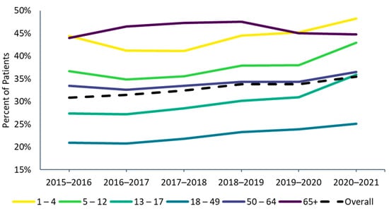 Influenza vaccine uptake increased between the 2016–2017 (31.4%) and 2020–2021 seasons (35.4%) (Figure 1). Across all seasons, the 18–49 age group consistently had the lowest vaccine uptake, while the oldest (age ≥ 65) and youngest (ages 1–4) age groups had the highest uptake (Figure 1). Vaccine uptake slightly increased since 2016–17 from season to season in all age groups except for the ≥65 age group, where it decreased slightly between the 2018–2019 and 2019–2020 seasons (from 47.5% to 45.0%) and stayed roughly the same in the 2020–2021 season (44.8%). In the 2020–2021 season, vaccine uptake increased slightly for patients 65 to 74 years of age (from 43.8% to 44.0%) but decreased in patients ≥75 years of age (from 47.3% to 46.6% in those 75–84 years from and 45.0% to 43.9% in individuals ≥85 years of age). Among children and working-age adults, influenza vaccine uptake increased steadily over the past vaccination seasons from 2016–2017 to 2020–2021, with a steeper increase observed in the 2020–2021 season for those <18 years of age.