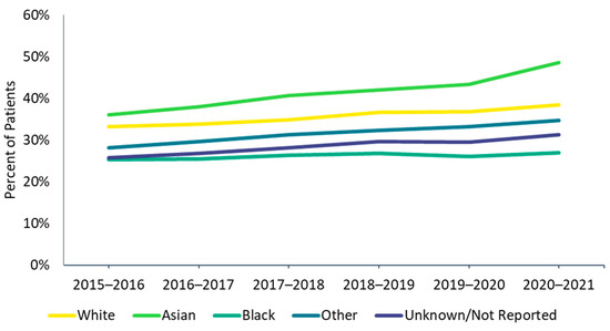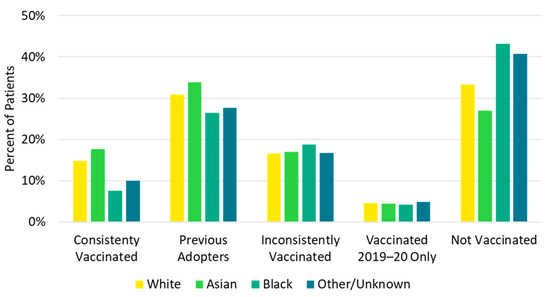Our observation of earlier vaccine uptake in 2020–2021 compared to prior seasons was an encouraging trend. In preliminary influenza vaccination uptake estimates, the CDC found that by mid-January 2021, the highest number of influenza vaccine doses were distributed in a single season, with 53% of adults vaccinated by mid-January 2021, compared with 45% at the end of January 2020 [14]. Additionally, in concurrence with CDC estimates of worsening racial disparities in influenza vaccine uptake [15], we show that during the COVID-19 pandemic in 2020–2021, vaccine uptake was lowest among Black individuals compared with Asian and White individuals. The COVID-19 pandemic may have exacerbated inequities in education, income, paid leave, and access to healthcare services [16]. Vaccine misinformation may have furthered distrust in the healthcare system and contributed to a higher perceived vaccine risk and greater vaccine hesitancy among minorities [17,18]; lack of information on vaccine benefits and current vaccine recommendations also reduced confidence in the vaccine [19]. Because influenza-related hospitalization rates are highest among minorities [15], closing the gap in racial disparities in influenza vaccination may substantially alleviate the burden of influenza on patients’ health as well as stress on the medical system.