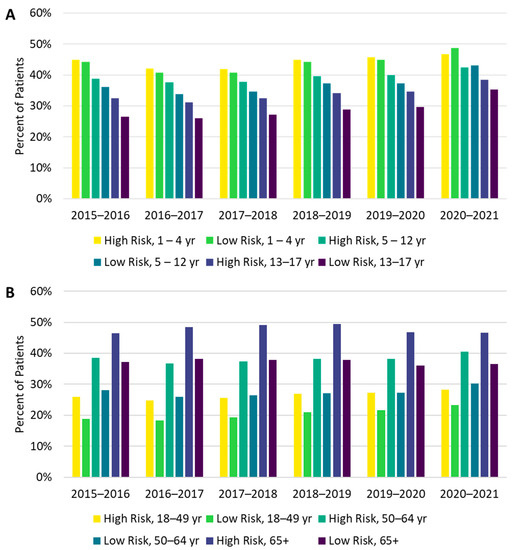 Vaccine uptake from the 2015–2016 through the 2020–2021 influenza seasons by risk and age group for individuals (A) 1–17 years of age and (B) 18 years and older.
