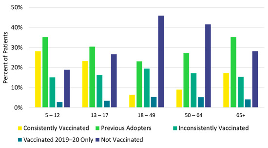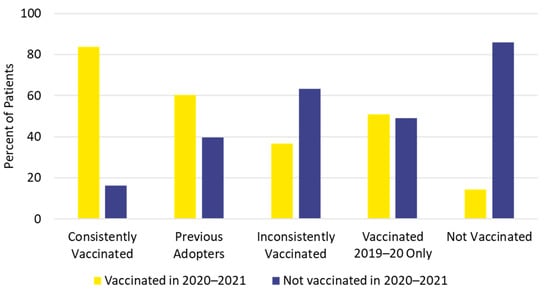 Influenza vaccination status in the 2020–2021 season was generally consistent with previous vaccination history. Individuals who were consistently vaccinated in the previous five seasons were also most likely (83.7%) to be vaccinated in the 2020–2021 season, whereas patients who were not vaccinated in any of the previous five seasons were least likely (14.2%) to be vaccinated for the 2020–2021 season. Other researchers have reported that previous vaccination against influenza has been associated with future influenza vaccine uptake [5,6,7]. In our report, 52% of continuously enrolled individuals were previously vaccinated at least some of the time, which may be the “low hanging fruit” to improve population vaccination uptake [27]. Even if this group lacks strong motivation for annual influenza vaccinations, improving access and providing reminders to heighten awareness may be effective in increasing the vaccination rate [27].