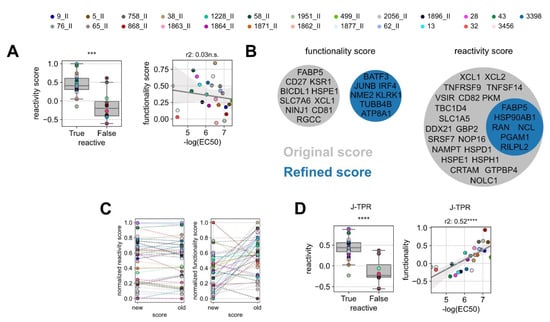 In the attempt of improving the predictive power of gene signatures, we de novo calculated the reactivity and functionality scores including all TCR:epitope pairs characterized so far (the pairs used for the training and the pairs used in this work as validation). For this, we redefined the gene list of the most differentially expressed genes between functional and non-functional TCRs, as well as the list of the top genes correlating to TCR functionality. From these lists, we identified the optimal number of top differentially expressed genes (‘refined’ reactivity score) and the optimal number of genes correlated to functionality (‘refined’ functionality score). The selection was carried out by iterative scoring of top n gene sets and score optimization by the selection of the most significantly discriminating of the best correlated gene set (Figure S5). Classical genes of effector T-cell functions were globally upregulated in most of the analyzed T cells; thereby, they were not enriched in any clonotype (Tables S4 and S5). Gene pools of the ‘refined’ functionality scores did not overlap with the original signature, while genes defining the ‘refined’ reactivity score were entailed in the ‘original’ signature (Figure 4B). In line with that, the individual reactivity scores of the TCRs remained stable after redefinition, whereas the values of the functionality scores changed drastically (Figure 4C).