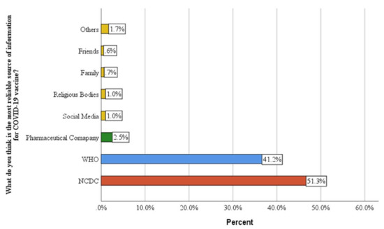 The trust of HCWs in national institutions will have a direct relationship with their level of acceptance of information they disseminate, affecting their compliance with government directives. Thus, in response to the question regarding the most reliable source of data on the COVID-19 vaccine, the majority of the respondents (about 51.3%) preferred the Nigeria Centre for Disease Control (NCDC), while 41.2% chose the World Health Organization, as shown in Figure 1. The relatively heavy reliance on NCDC and WHO for information about COVID-19 vaccines may be attributed to the quality and reliability of the information published weekly, monthly and quarterly by the institutions on current issues about COVID-19 vaccines, especially on the safety profile, clinical trials and approval. Similarly, a study among Indians revealed that a little less than two-thirds (64.5%) of the respondents have higher trust in India’s healthcare system [30].
