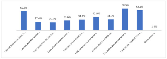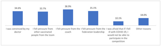 Those who declared that they had been vaccinated against COVID-19 did so mainly because they felt pressure from their coach (Figure 1). Moreover, those who had not been vaccinated against COVID-19 did not do so most often because their coach had advised them not to get vaccinated (Figure 2).