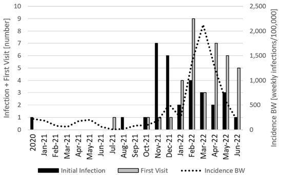 Timeline between initial SARS-CoV-2 infection/vaccination and first visit of cause of post-acute sequelae (PASC). X-axis: time; left Y-axis: number of initial infections and first visits in this month. Right Y-axis: Monthly new SARS-CoV-2 infections in Baden-Württemberg (State in southern Germany, BW).