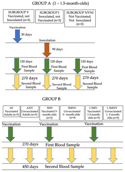 Two experimental groups were used in this study (Figure 1). Group A consisted of nine 1- to 1.5-month-old Murciano-Granadina kids managed under experimental conditions and vaccinated with the inactivated vaccine against paratuberculosis (Gudair®, Vetia Animal Health, S.A., Madrid, Spain). The animals were orally challenged with a total dosage of 1.2 × 1010 mycobacteria, given in four doses, of the type C K-10 strain of Map, 30 days after vaccination. Three different subgroups were established within this group: vaccinated animals (V), formed by three kids that had been vaccinated, but not challenged; infected (I), composed of three kids that had been challenged with Map, but not vaccinated; and the not vaccinated not infected (NVNI) group, formed of three kids that had not undergone any treatment. In these animals, the peripheral production of IFN-γ was evaluated, using the IGRA technique, after stimulation of the blood samples with different mycobacterial antigens (detailed in Section 2.2) at 120 days post-vaccination (dpv) (90 days post-infection (dpi) and at 270 dpv (240 dpi).