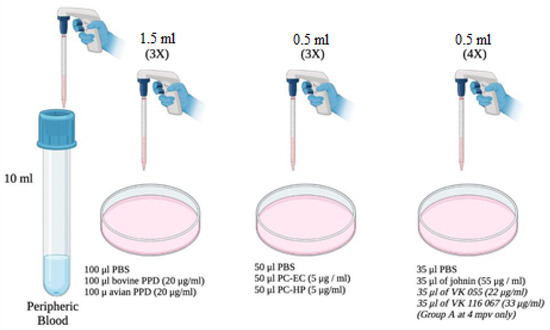 The blood samples were collected in 10 mL Vacutainer® tubes (Becton Dickinson, Plymouth, UK) with heparin, by jugular vein puncture. Within 4 h after collection, three 1.5 mL aliquots of blood were taken and stimulated respectively with the following compounds and concentrations: 100 µL of phosphate-buffered saline (PBS), 100 µL of bovine PPD (20 µg/mL), and 100 µL of avian PPD (20 µg/mL). In addition, another three aliquots of 0.5 mL of blood were stimulated with: 50 µL of PBS, 50 µL of the peptide cocktail PC-EC (5 µg/mL), and 50 µL of the PC-HP peptide cocktail (5 µg/mL). Finally, four aliquots of 0.5 mL of blood were stimulated with 35 µL of PBS, 35 µL of johnin (55 µg/mL), 35 µL of VK 055 (22 µg/mL), and 35 µL of VK 067 (33 µg/mL), respectively. The latter, as mentioned, only involved animals from Group A at 4 mpv.