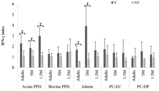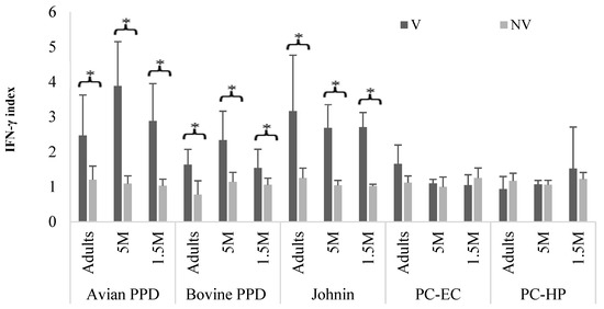 Group B. Mean and SD values of the IFN-γ index in animals of the different age subgroups, according to the antigen used to stimulate the blood, at 9 mpv. M: months old; mpv: months post vaccination; V: vaccinated; NV: not vaccinated. Error bar: standard deviation (SD). Significant difference (*).