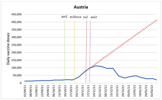 The purpose of the ARIMA model was to determine the impact of the following intervention variables: introduction of “freedom pass” (m1force), introduction of financial incentives for pharmacists and doctors (m2), introduction of COVID-19 certificates (m3), entry into force of the vaccine mandate for adults aged 60 and older (m4force), announcement of entry into force of “freedom pass” (am1), and announcement of entry into force of the vaccine mandate for adults aged 60 and older (am4). Figure 2 shows the time series with the intervention time points.