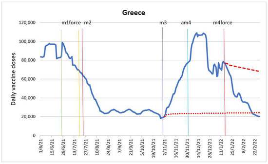 Daily new vaccinations in Greece before and after the policy changes and predicted values in absence of interventions based on ARIMA models.