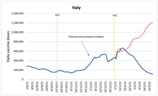 The main reason for estimating the model was to determine the impact of intervention variables, specifically, the entry into force of the “Green pass” mandate for employees (m1) and the entry into force of the vaccine mandate for adults aged 50 and older (m2). Figure 3 shows the time series with the intervention time points.