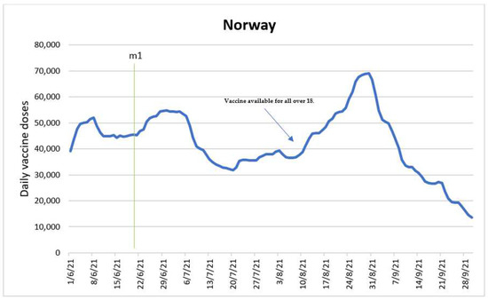 Daily new vaccinations in Norway before and after the policy change.
