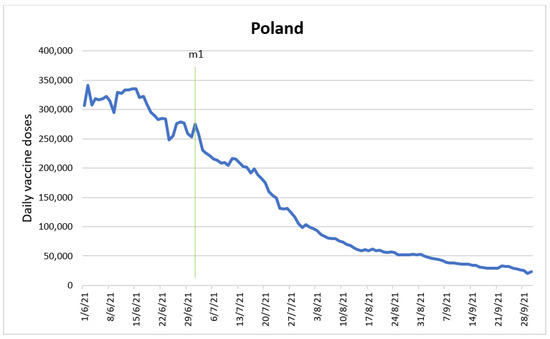An ARIMA ARCH model was developed to determine the impact of the intervention variable “introduction of discounts and vouchers for the vaccinated” (m1) on the number of doses administered. Figure 8 shows the time series with the intervention time point.