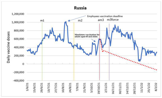 Even though the analysis showed an immediate negative effect of the introduction of the employee vaccine mandate, the intervention produced a positive delayed effect. Russia’s vaccination curve reflects the regulation implemented in many regions of the country, according to which the employers must vaccinate with the first dose 60% of the employees by the middle of July 2021 and with the second dose by the middle of August 2021 [33,34]. This measure was accompanied by additional supply of COVID-19 vaccines to the regions and setting up additional vaccination points [35].