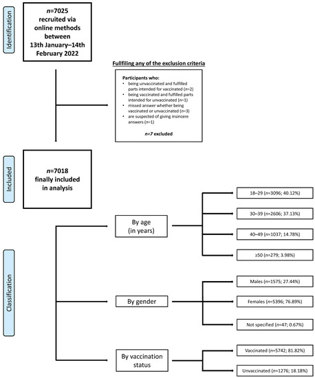 The study was conducted between 13 January and 14 February 2022 among Polish citizens. At that time, the number of COVID-19 infections in Poland, referred to as the “fifth wave” of the pandemic, was increasing. Of the 7025 adults who participated in the study, 7018 met the study conditions. To be included in the study, the respondent (1) had to be at least 18 years of age (2) and be able to complete an online survey. Exclusion criteria included: (1) fulfilling questions in the wrong category, (2) responses with a high suspicion of being insincere (such as person under 30 with 10 or more children) and (3) omission of the answer to the question about vaccination status. Respondents were classified into groups based on their gender, age and vaccination status. The full participants selections process is presented on the Figure 1.