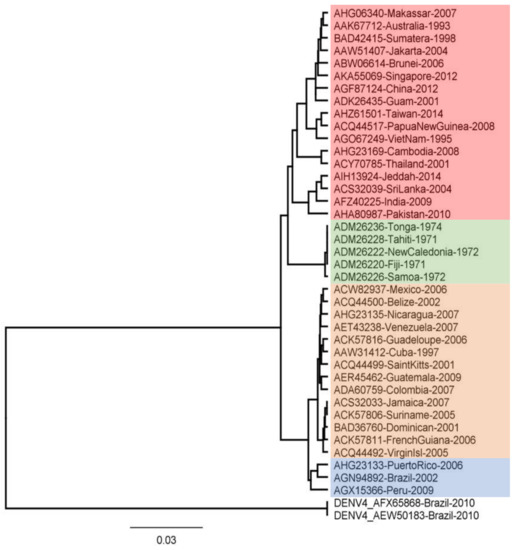 Evolutionary relationships of DENV-2 RNA-Dependent RNA Polymerase Protein. The evolutionary history was inferred using the UPGMA method. The evolutionary distances were computed using the Jukes–Cantor Method. Evolutionary analyses were conducted in Geneious. The DENV-4 sequences, which serve as outgroup, are from Brazil.