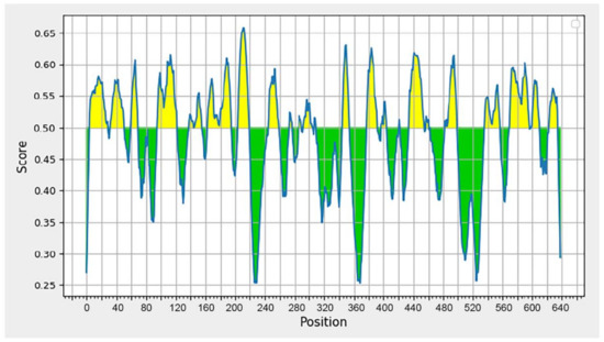The BepiPred [61] was used for the analysis of B-cell epitopes because the application has a high prediction accuracy on the test data collection, and it has been demonstrated to perform significantly better than other methods. Antibodies in the immune system recognize a molecule by its B-cell epitopes [62]. The DENV-2 sequence from Sumatra (BAD42415) was used to predict B-cell epitopes. Figure 2 depicts the outcomes of the prediction. Residues with a score greater than 0.35 are displayed in yellow and are candidates for predicted epitopes [63].