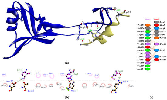 Figure 3 depicts a molecular docking visualization. This visualization is required to ensure that the epitope can interact with the paratope at the dendritic cell receptor’s active site. According to the results of two-dimensional (2D) imaging, there are amino acid residues that establish hydrogen bonds (H-bonds) and hydrophobic interactions with the active site of the receptor. These amino acid residues form H-bonds with interaction distances ranging from 2.51 to 3.02 Å. There are seven H-bonds that bind to the active site region of the paratope at residues Arg151, Gln154, Asp157, Thr159, and Glu172. H-bonds contribute significantly to ligand–receptor interactions and contribute to the stability of the complex [72]. The angle at which the bond is formed is another important factor to consider. The strength of the hydrogen bond is directly proportional to the degree to which its geometry is accurate [73]. Additionally, the epitope interacts hydrophobically with the paratope at residues Trp153, Val156, Trp155, Tyr161, Asn162, Thr166, Val165, Trp168, Glu172, Pro173, and Asn174. There is also the formation of salt bridges between Lys15 and Asp157, as well as Lys7 and Glu 172. In many cases, the structural driving forces that increase the interaction stability are related to salt bridges [74]. The more bonds formed between the peptide and the active site of the receptor, the more stable the interaction, and the more negative the energy, the stronger the potential activity of the epitope vaccine.