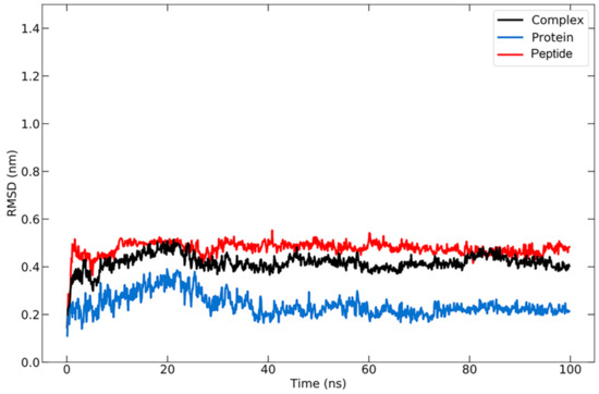 RMSD graph for protein backbone (in blue), peptide (in red), and the protein–peptide complex (in black) during 100 ns simulation.