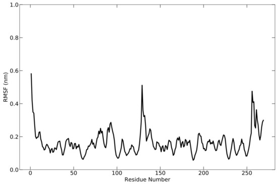 During the simulation, the flexibility of the complex was analyzed using root-mean-square fluctuation (RMSF) (Figure 5), which allowed for the acquisition of additional information regarding the fluctuating protein regions. RMSF is the square root of the average fluctuation between the positions of atoms and the reference structure. Protein flexibility is calculated for each amino acid residue to see how each residue fluctuates or moves during the simulation. During the simulation, the fluctuation occurred around 0.59 nm. This is demonstrated by the presence of multiple peaks on the graph.