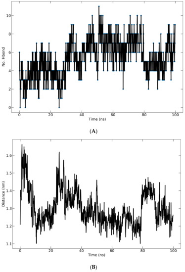 (A) Hydrogen bonding of protein–ligand complex; (B) average distance between peptide and protein during 100 ns simulation.