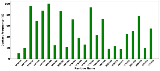 Contact frequency (CF) analysis was performed to further evaluate the binding between the protein–ligands tested. Interactions between proteins and ligands are vitally important to almost every process that takes place in living organisms [79]. The analysis was performed using the contactFreq.tcl module in VMD with a cutoff of 4 Å. Residues with a higher percentage of CF (>90%) are Arg150, Pro147, HSD152 (prototropic tautomer of histidine), and Glu163 (Figure 8). This indicates that the interaction is within the cutoff, which is typical of van der Waals interactions.
